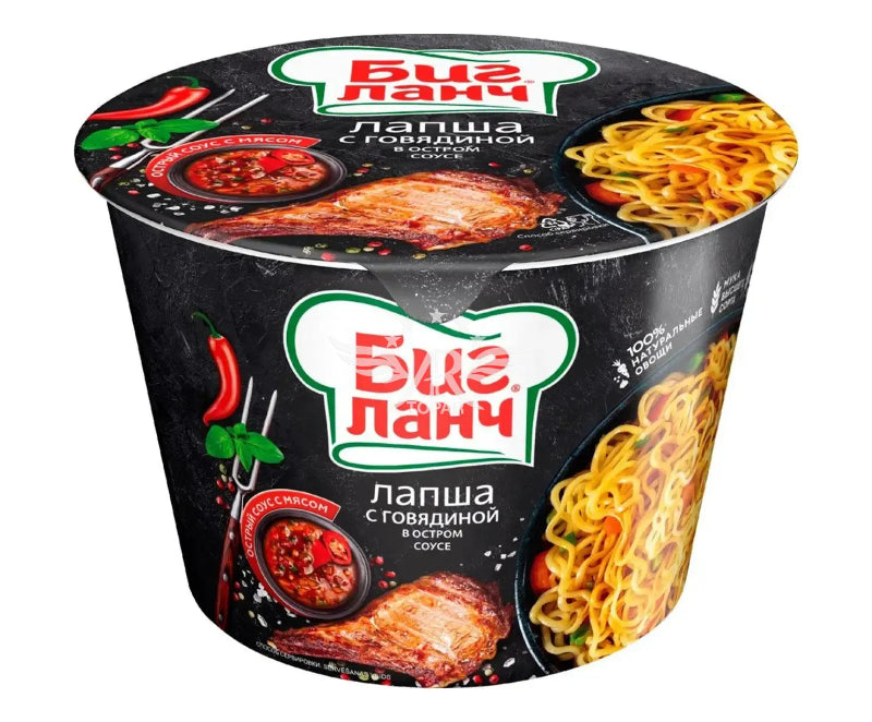 Experience a hearty and spicy meal on-the-go with Big Lunch instant noodles. Made with tender beef and a fiery hot sauce, these noodles are the perfect quick and satisfying meal for any occasion. Enjoy the convenience and flavor of Big Lunch noodles today!