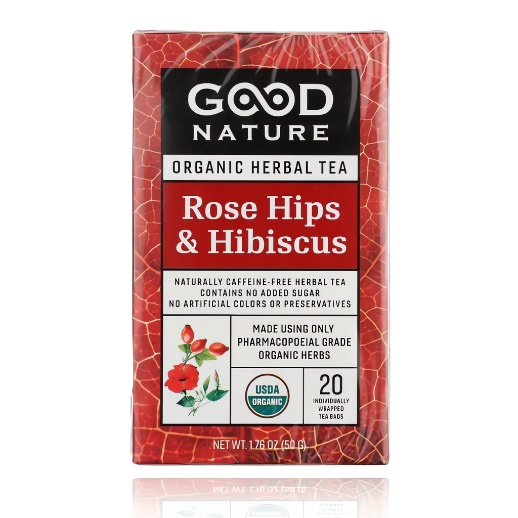 Indulge in the delicious and nutrient-packed Good Nature Tea Hibiscus & Rosehips. Made from organic rose hips and hibiscus, this herbal tea is loaded with Vitamin C and natural antioxidants. Say goodbye to artificial ingredients with this sugar-free, preservative-free tea. Each box contains 20 tea bags for your enjoyment.