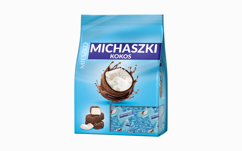 Expertly crafted by Mieszko, Michaszki Kokosowe are a delicious treat of chocolate coated in shredded coconut. Indulge in the perfect balance of sweetness and texture with every bite of these delightful candies. Available in a convenient 260 g pack.