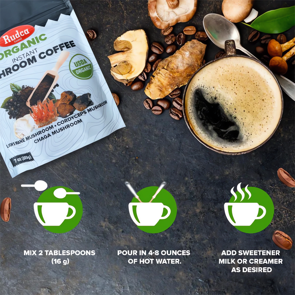 Rudca food's Organic Instant Mushroom Coffee is the perfect way to start your day. Made with organic ingredients, this premium quality coffee provides a natural energy boost without any additives or artificial flavors. Stay energized and healthy with Rudca Food's mushroom coffee.