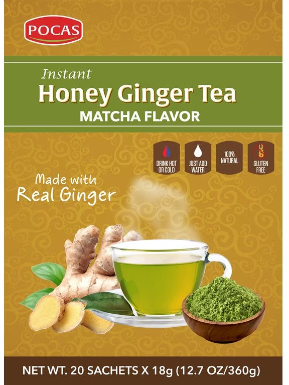 Introducing Pocas Honey Ginger Tea with Matcha 20 Tea Bags, a 100% natural blend made with real ginger. Enjoy this delicious tea hot or cold by just adding water. Experience the benefits of real ginger while indulging in a refreshing beverage. Perfect for any time of day.