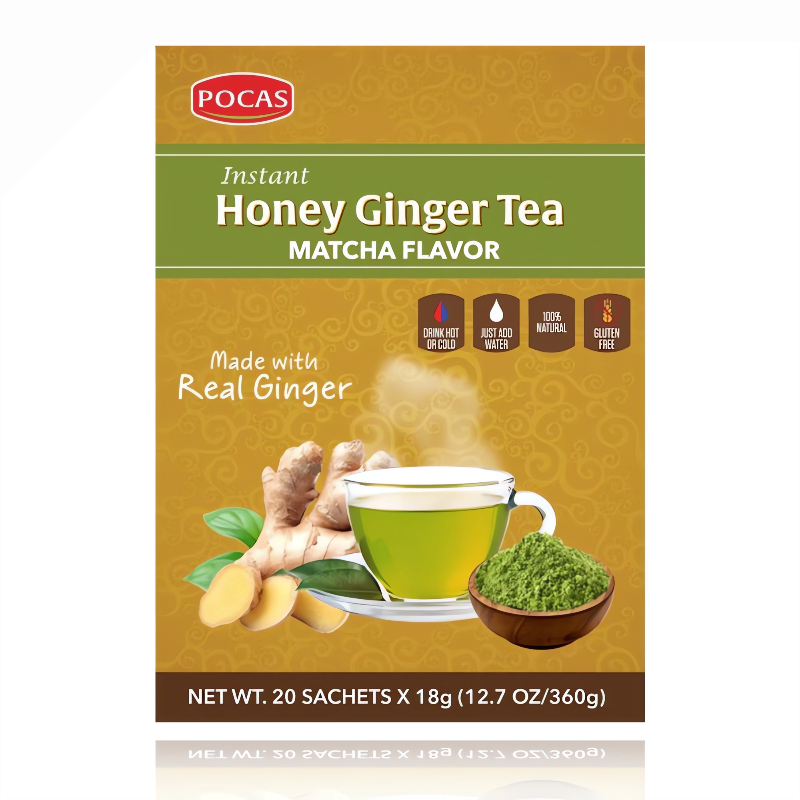 Introducing Pocas Honey Ginger Tea with Matcha 20 Tea Bags, a 100% natural blend made with real ginger. Enjoy this delicious tea hot or cold by just adding water. Experience the benefits of real ginger while indulging in a refreshing beverage. Perfect for any time of day.