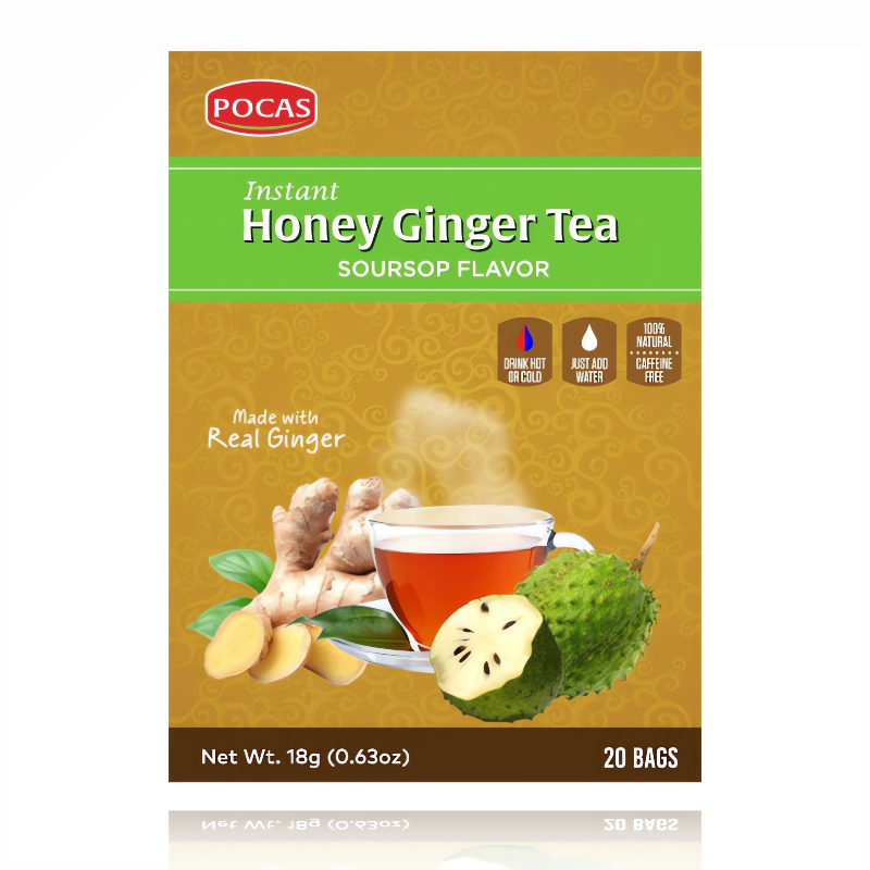Indulge in a warm cup of Pocas Honey Ginger Tea with Soursop. Made from all-natural ginger crystals and sweetened with honey, this instant tea powder can be enjoyed hot or cold. Incorporate it into your daily routine for a delicious and beneficial boost to your wellness.