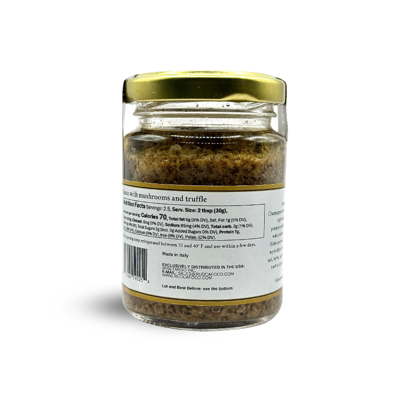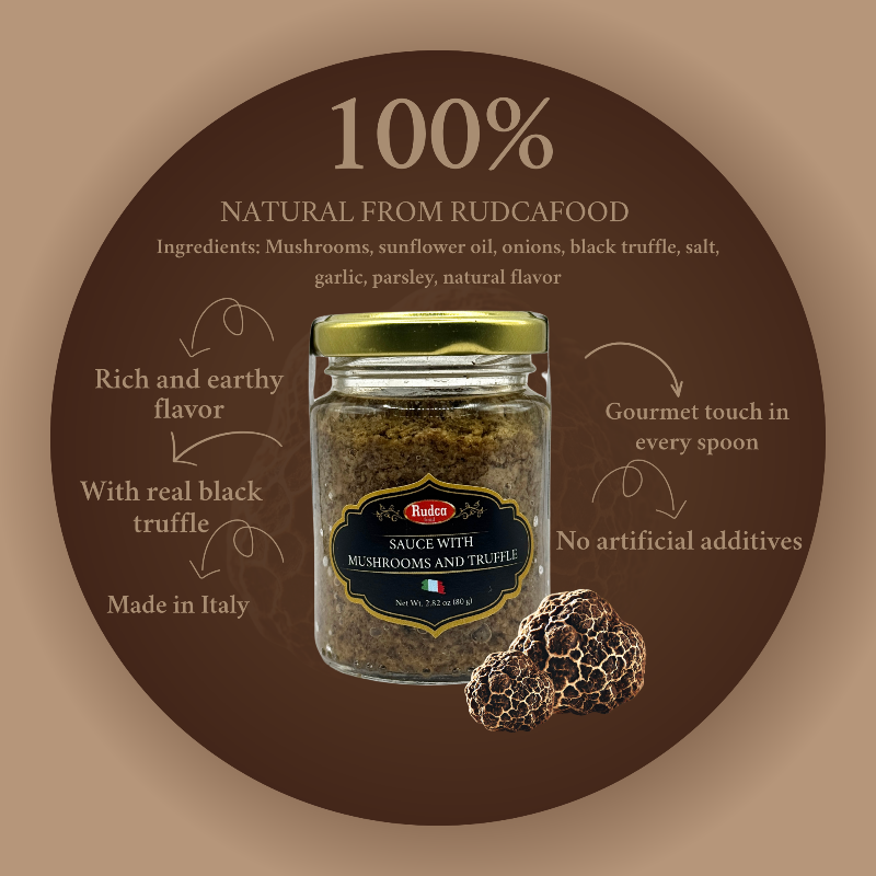 Experience a gourmet transformation with Rudca Food's Sauce with Mushrooms and Truffle. Our blend of mushrooms and truffle elevates any meal to a gastronomic delight. Indulge in the exquisite flavor and aroma of this 2.82 oz sauce. Perfect for any food lover seeking a touch of luxury to their dining experience.