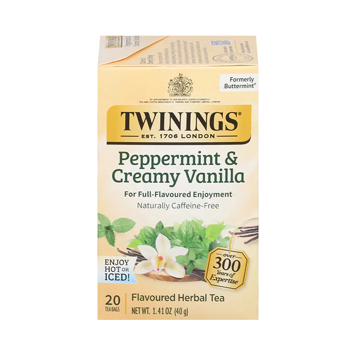 Indulge in a sensory delight with Twinings Herbal Tea Peppermint & Creamy Vanilla. Infused with the rich and creamy flavor of vanilla, this velvety smooth tea is perfect for moments of relaxation and rejuvenation. Each bag contains pure, natural ingredients for a truly satisfying cup every time.